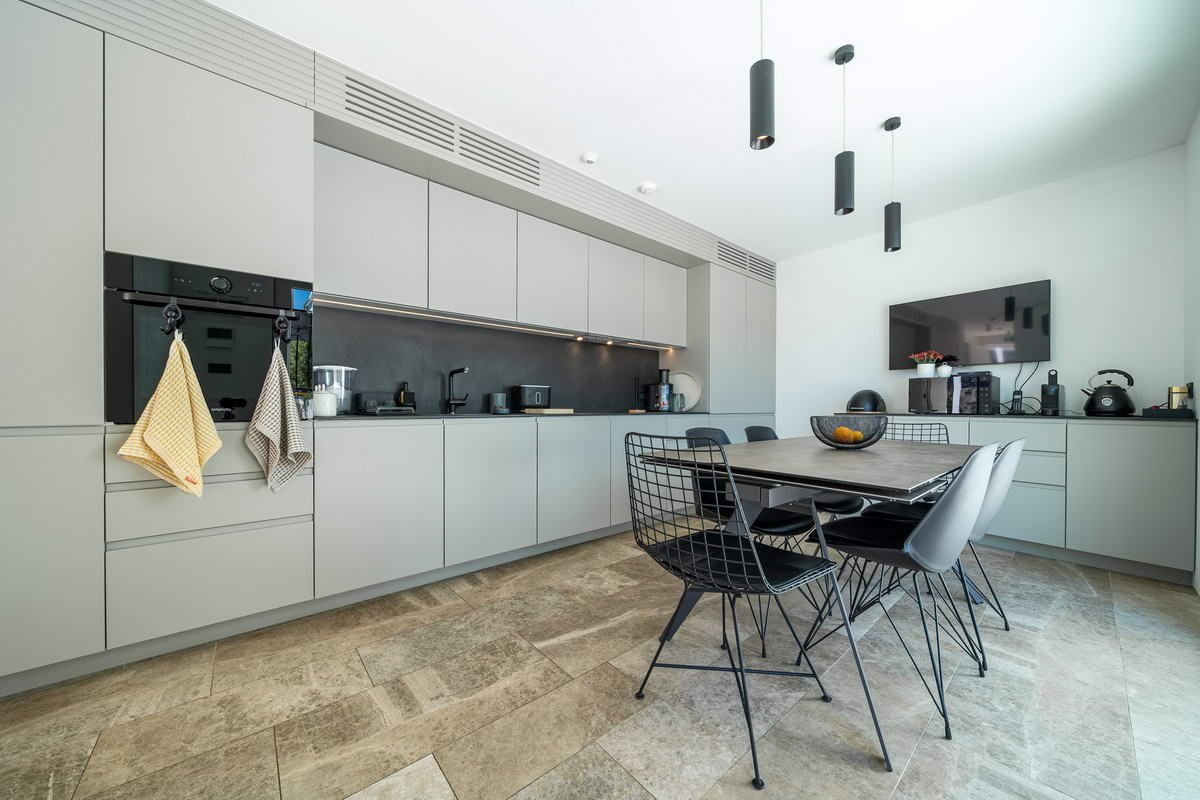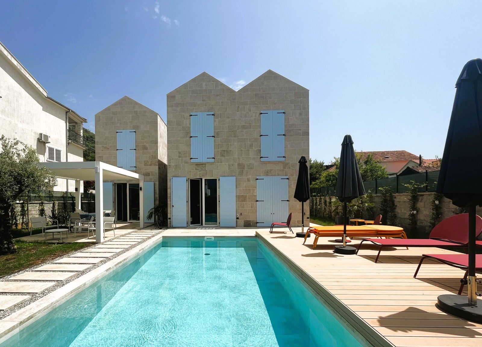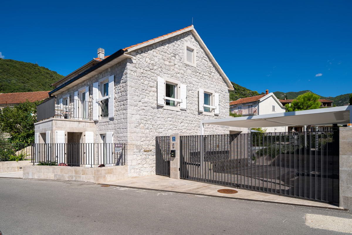 New-built modern villa. Kitchen and dining area open to a terrace with a pergola. Large living room with fireplace, laundry room, and guest toilet. The first floor has three bedrooms, each with an en-suite bathroom and sea view. Outdoor features include a swimming pool with a lounging deck, an outdoor shower, a gated parking area for 3–4 cars, and a storage room for bicycles. Inspired by the famous Tre Sorella building in Perast, this modern villa is equipped with surveillance cameras, an alarm system, and wifi.