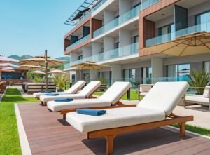 The residential complex offers an open swimming pool, a rooftop restaurant and bar, a poolside bar, and transfer services to the town and beach. Residents also have access to a fitness centre, spa, massage rooms, sauna, and meeting rooms.