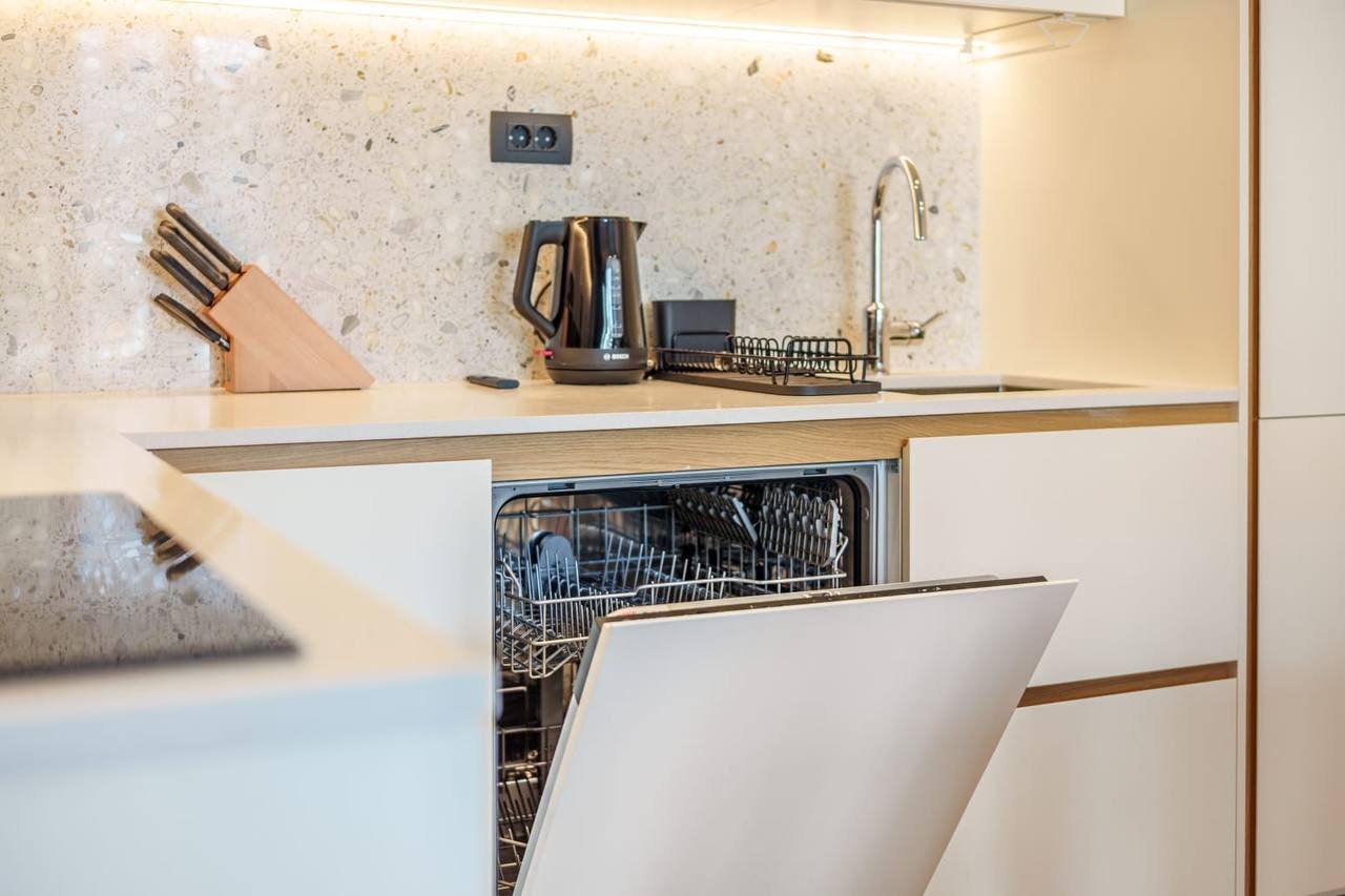 - Access to swimming pool and hotel amenitiesThe apartment features a functional layout with a bright living room, kitchen with dining area, one bedroom, and a bathroom. It is fully furnished with modern finishes and designer furniture, and is ready for immediate use. A private balcony adds outdoor space and natural light.