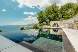 Set across an impressive 7,138 m² property, the estate offers unobstructed panoramic views of the Adriatic coastline and surrounding mountains combined with complete privacy and serenity. Built in 2006 and carefully renovated in 2010 and 2020, the residence showcases refined Mediterranean architecture with hand cut natural stone, marble terraces and warm hardwood flooring. Bright living areas with high windows open onto patios and cascading landscaped gardens filled with Mediterranean plants and fruit trees connected by walking paths.