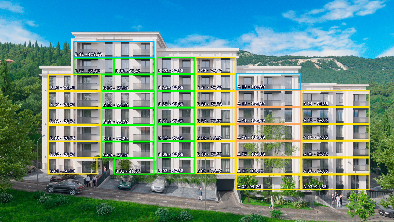 - Exclusive penthouses up to 140 m² with private elevator, storage room, garage space and panoramic sea and mountain views, €546,450