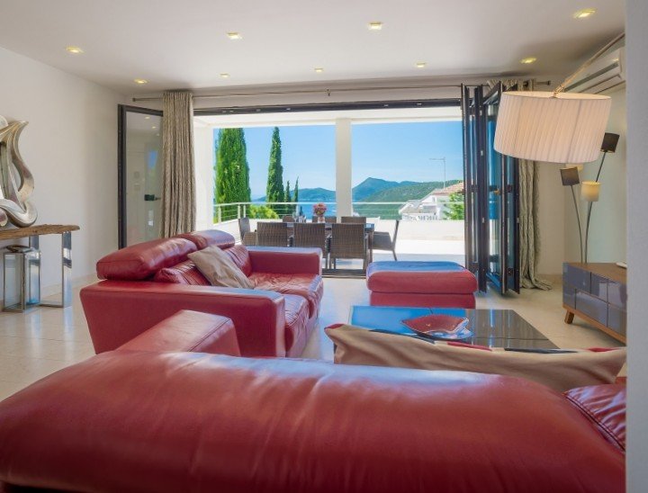 - Spacious living room with open kitchen leading to a large sea-view terrace