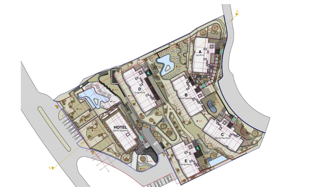 The hotel features two garage levels, a reception lobby, hotel bar, a spa centre, and 2 restaurants. The landscaped grounds include multiple swimming pools, and carefully designed green areas.