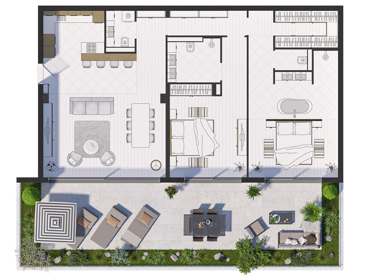 The duplex layout includes a first floor with a living area, open kitchen, guest WC, and terrace access. Upstairs, both bedrooms have en-suite bathrooms, along with a technical/utility room. Optional garage spaces are available separately. Flexible payment terms can be arranged to suit individual buyers.