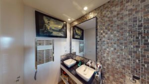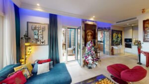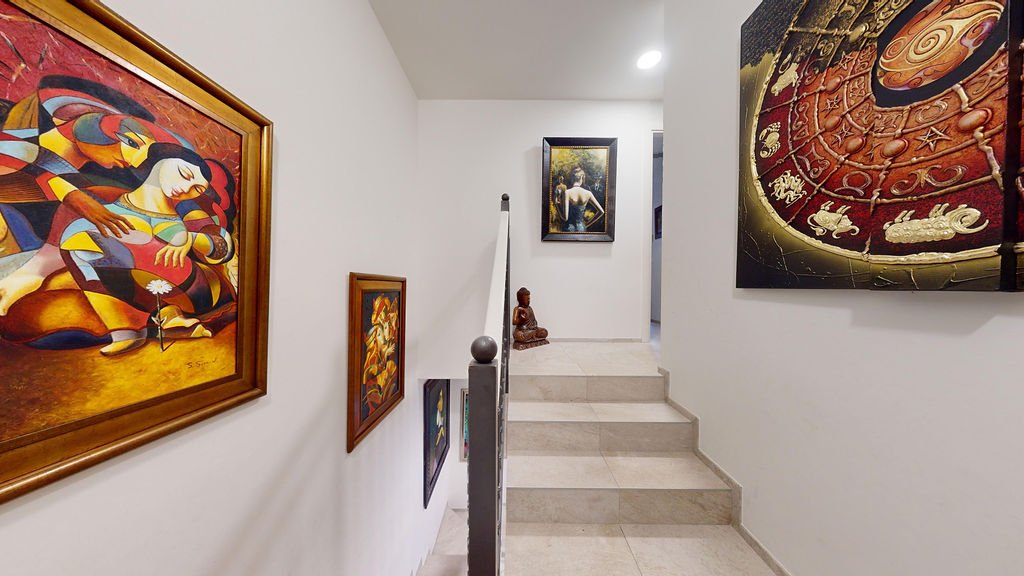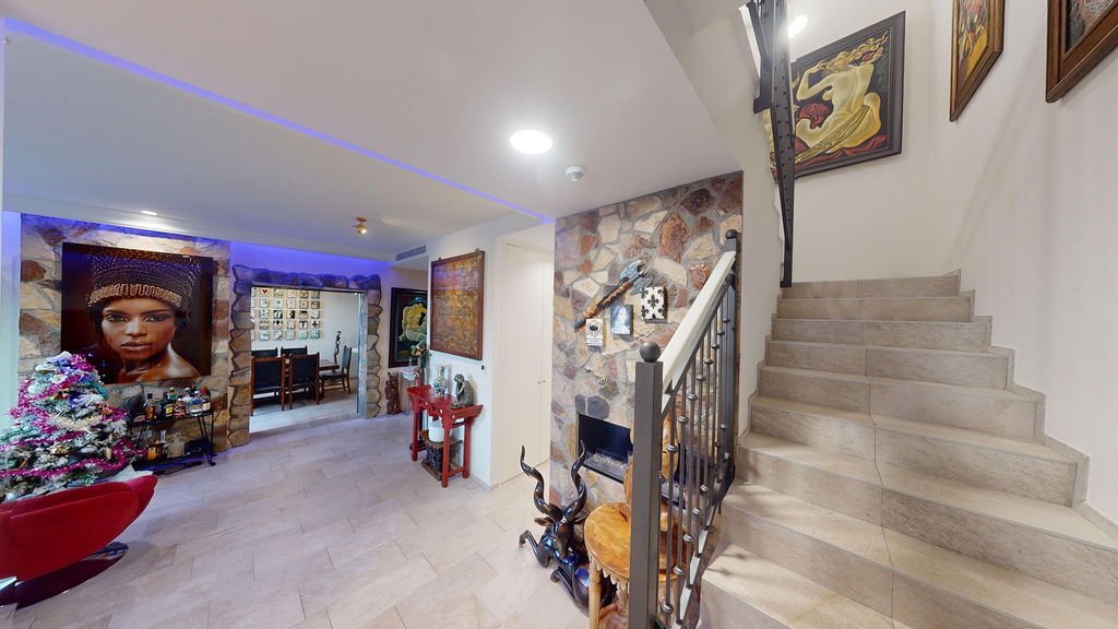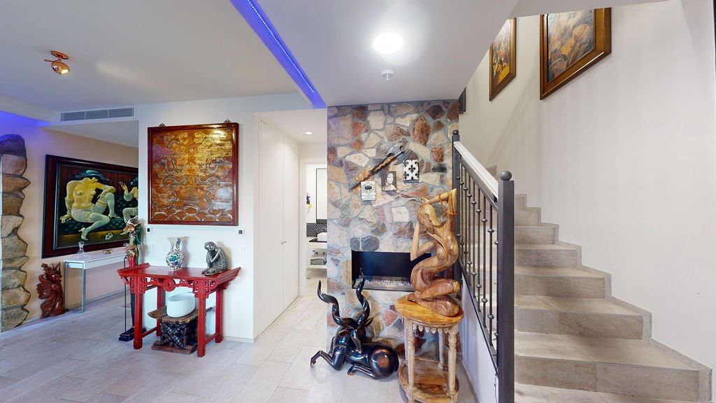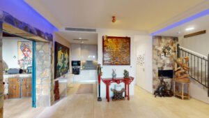 The property is thoughtfully designed across multiple levels, featuring bright and spacious living and dining areas, a fully equipped luxury kitchen, and two elegant bedrooms, each with its own terrace and en suite bathroom. A welcoming reception area with guest toilet, a separate street level entrance, and a private garage add to the comfort and practicality of this exceptional home.