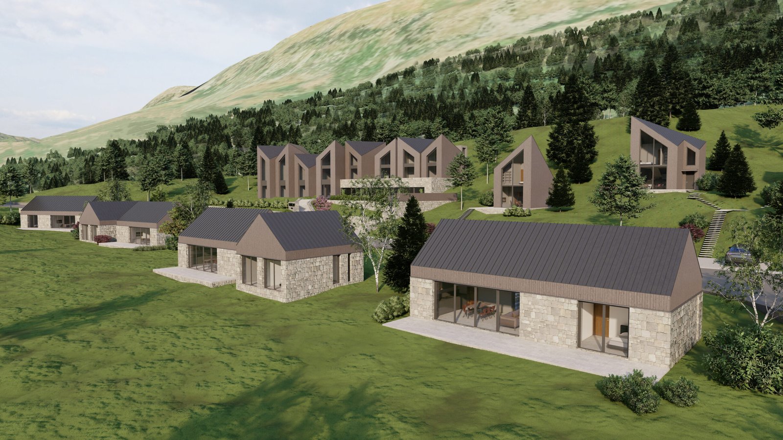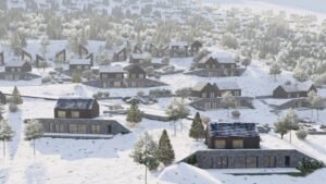 Various types of houses in a uniform style will be constructed: chalets, free-standing houses, and semi-detached houses, along with a hotel. You can choose your plot location, house type (from seven options), and usage (residence, vacation home, or rental).